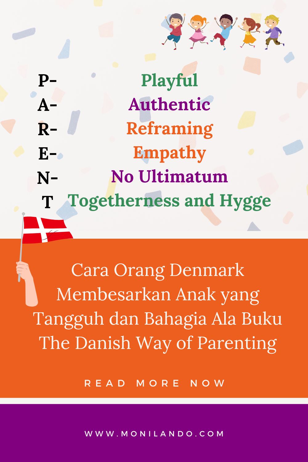 Syukurnya, penulis telah menciptakan akronim yang mudah diingat tentang cara atau rahasia orang tua Denmark mengasuh anak. P-A-R-E-N-T dalam buku The Danish Way of Parenting.