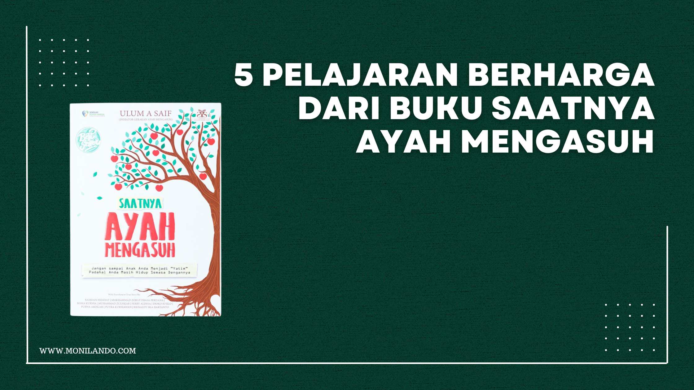 Buku Saatnya Ayah Mengasuh yang disusun oleh Ulum A. Saif bertujuan menyadarkan para pembaca agar jangan sampai anak menjadi “yatim” padahal ayahnya masih hidup semasa dengan sang anak. Berikut beberapa pelajaran berharga dari buku setebal 199 halaman ini :